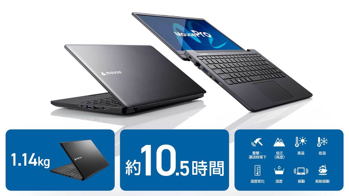 筐体はMIL規格(MIL-STD-810H)に準拠した8項目の耐久試験をクリアしており、外出先での業務や通勤時の持ち運びなど、移動の多いビジネスシーンでの利用を想定している。重量はおよそ1.14kgで、バッテリー駆動時間は、動画再生時でおよそ3.5時間、アイドル状態でおよそ10.5時間とされている。
