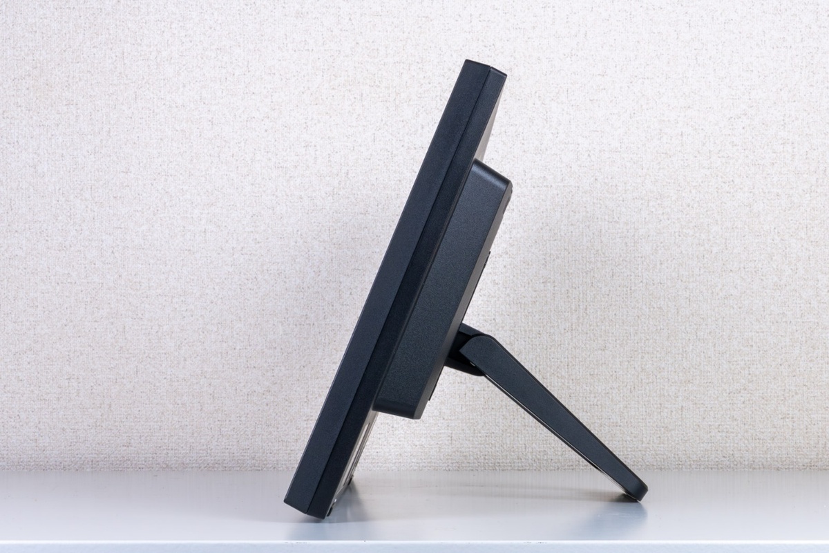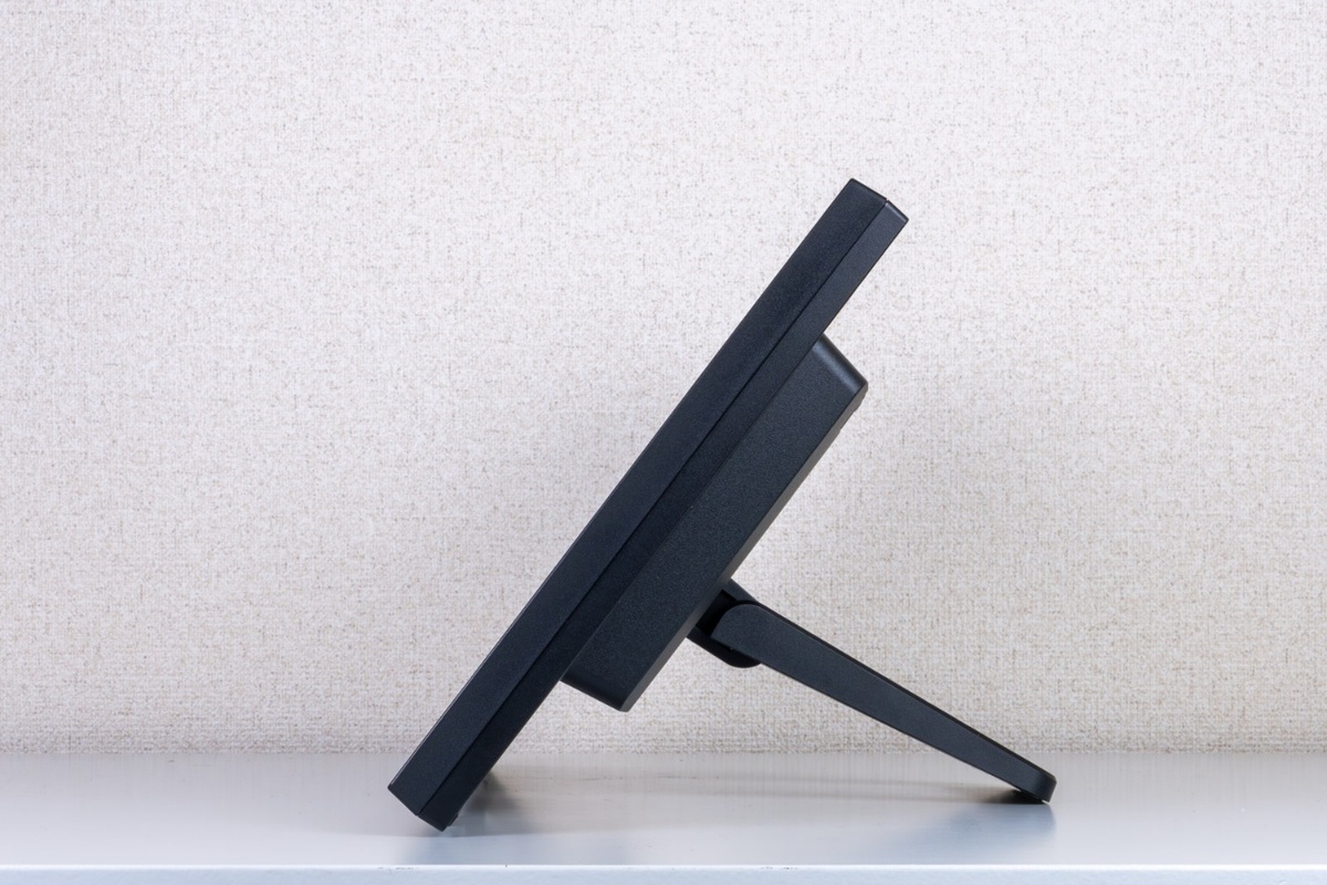 通常のディスプレーとは異なり、アーム式のスタンドではなく、机上で立てかけて使うためのスタンドが装備されている。これにより、実際にタッチ操作したときに揺れたり動いたりすることはなく、確実な操作が可能だ。