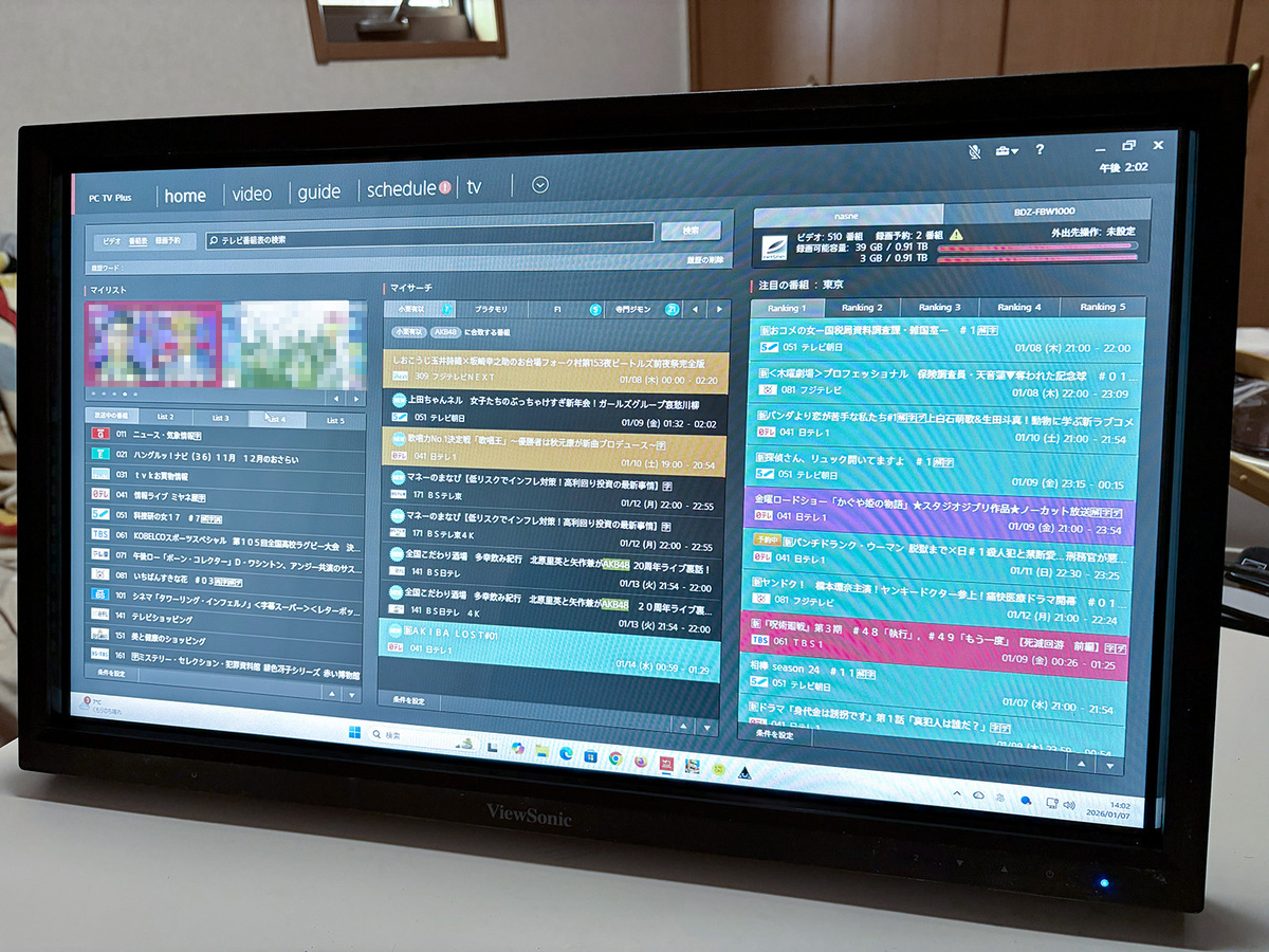 筆者は、ネットワークレコーダーの「nasne」を所有しており、F1中継をはじめとしたスポーツ番組やバラエティー番組をサブディスプレーに映しながら作業をすることがよくある。ソニーのレコーダーをネットワーク経由で視聴するアプリ「PC TV Plus」はHDCP対応が必要だが、HDMIやDVI-D接続なら視聴可能。これにより、タッチで操作できるテレビの完成だ。