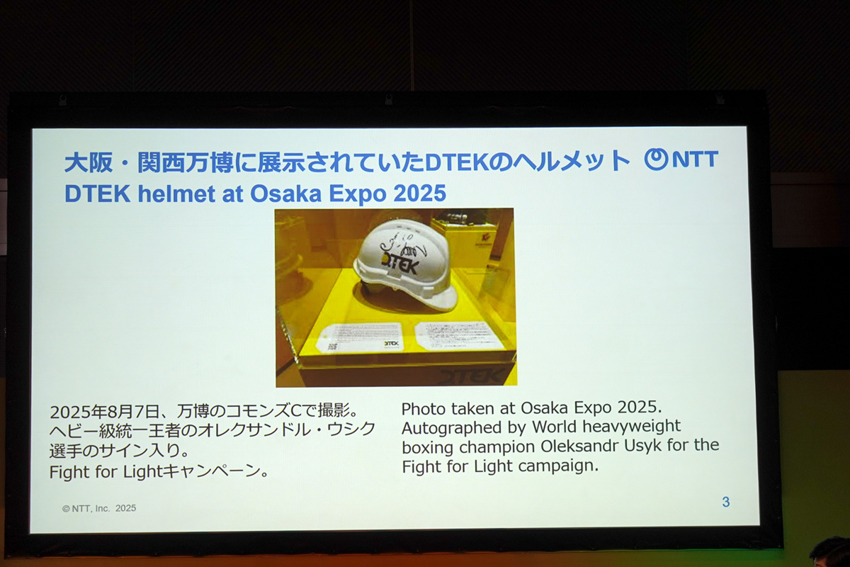 松原氏が紹介したDTEK社員のヘルメットには、ウクライナのボクシングヘビー級統一王者、オレクサンドル・ウシク選手のサインが記されていた。何度ダウンを奪われても立ち上がり戦い続けるボクサーの精神は、破壊されてもなおインフラを維持し続ける企業の姿と重なる。