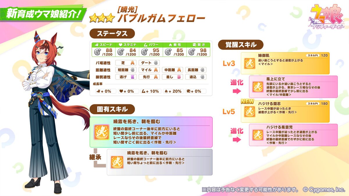 Cygamesは1月7日、ゲーム「ウマ娘 プリティーダービー」にて新衣装の★3育成ウマ娘「[暁光]バブルガムフェロー」が登場するガチャを告知した。期間は1月8日~1月19日まで。
