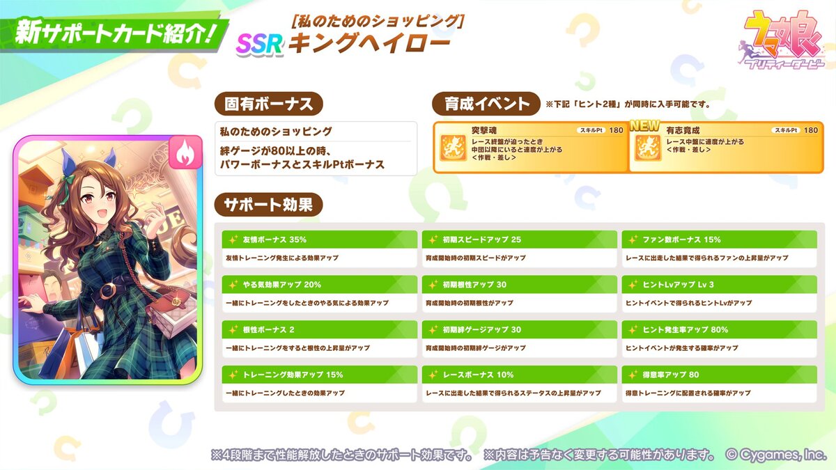 また、同時にサポートカードガチャではSSRキングヘイロー・SRサトノダイヤモンドが登場。ショッピングを楽しむキングヘイローの姿に「イラストは百点満点」「一流のスタイルとファッションセンスが俺を狂わせる」「私服買い物デート最高か」などの声が寄せられていた。