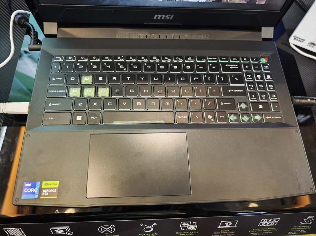 Katanaシリーズは「Katana 15 HX」のみの展示でした。このモデルは「龍の意志」を継承したデザインと、効率的な冷却機構が特徴の15.6インチモデルです。CPUはIntel Core i9 14900HXを搭載しており、高いクロックとマルチコア性能により、高速でレスポンスの良いゲーム体験を実現します。ディスプレーは15.6インチ(2560×1440ドット)のIPSパネル、リフレッシュレートは165Hzに対応します。