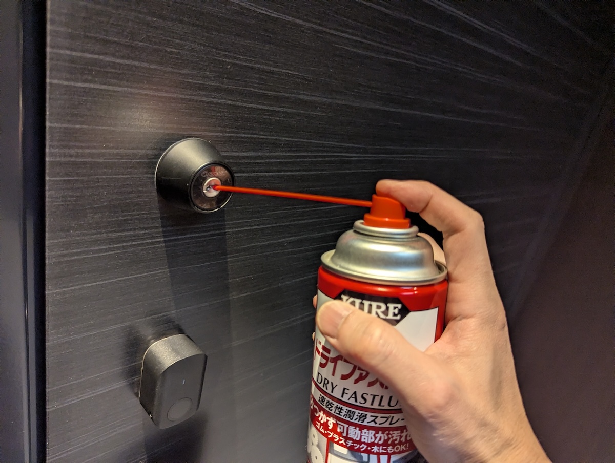 キャップに貼られたシールに「ベタつかないパウダータイプ」「鍵穴にもおすすめ!」とある通り、他の潤滑スプレーでは使用禁止となっている鍵穴にも使えるのが特徴です。ベタつかないということは、ホコリや汚れがつきにくいということ。そのため、汚れを洗浄できないような部分にも使えます。