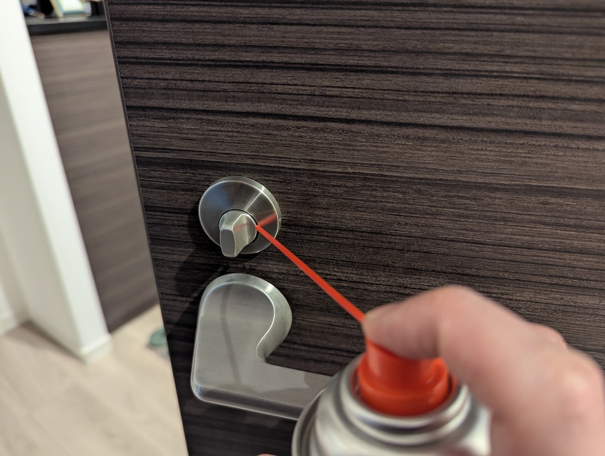 個人的に忘れず吹き付けておきたいのが、トイレの鍵。以前、締めたら固くて戻らなくなり、あわやセルフ監禁状態になるかと焦ったことがあるからです。鍵穴のように穴はありませんが、回転部近くの隙間からシュッと吹き込めば大丈夫でしょう。