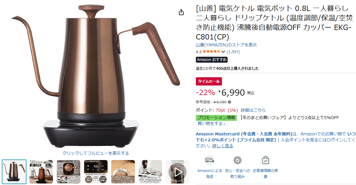 「山善 電気ケトルEKG-C801(CP)」の参考価格は8,980円ですが、セールでは22%オフの6,990円という割引価格で手に入ります。