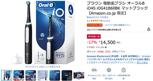 ブラウンの電動歯ブラシ「オーラルB iO4S iOG41B60BK」が、Amazonでタイムセール対象となっています。参考価格17,380円のところ、現在は17%オフの14,500円で購入可能です。