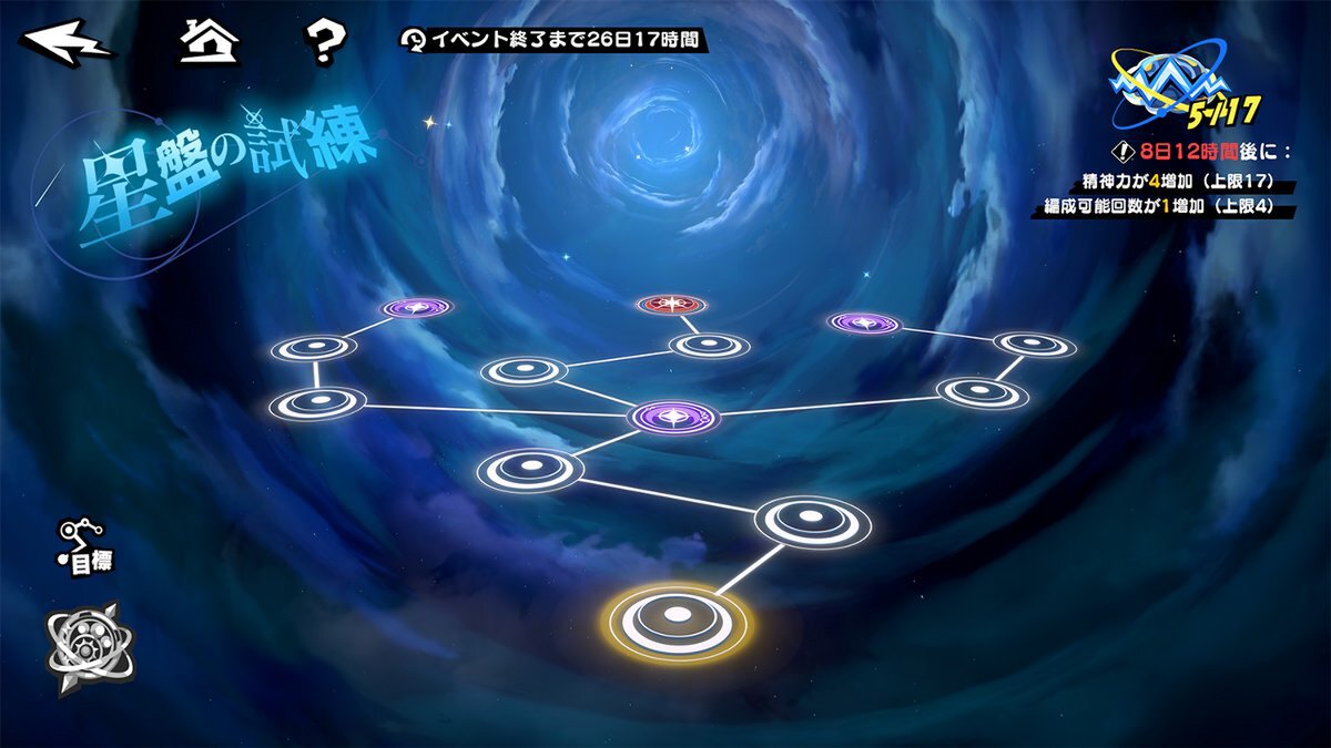 また、“イメジャリー”の強化素材「明星晶珠」や「星屑晶珠」などが手に入る新たなバトルコンテンツ“星盤の試練”が登場。“星盤の試練”は、限定された挑戦回数とキャラクターの使用回数にあわせてパーティ編成を工夫しながら、星座モチーフで散りばめられた各ステージの攻略を目指す、踏破型のコンテンツだ。