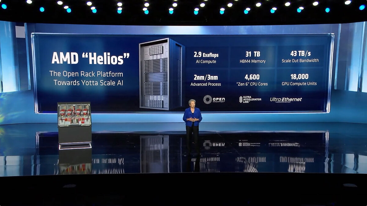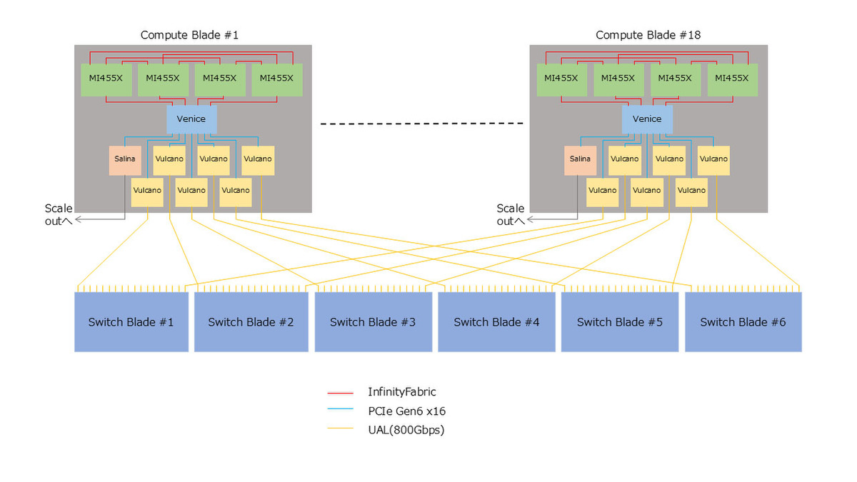 次はVeniceとMI455Xの詳細である。今回初めてHeliosの詳細が公開されたが、CPUコアは全部で4600個とある。Compute Bladeは全部で18枚なので、4600÷18=255.555……でCompute Bladeが1枚あたり256コアという計算になる(256×18=4608なので、丸めれば4600コアである)。