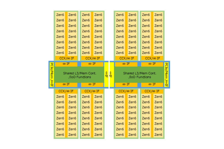 2つめの可能性は、CCDの側がZen 5の3D V-Cacheと同じく2層構造になっており、Compute Dieの下にL3 Dieが位置しており、これでL3をローカルに持つ構造だ。ただし、コストが思いっきり上がるのであまり現実的な案とは思えない。特にCCDをコンシューマー向けのRyzenと共用する構図が引き続き維持されるのだとすればなおさらだ。それよりはIoDの方にL3を置いて、必要ならそのIoDの側のL3をそれこそ3D V-Cacheのように積層する形で増量する方が妥当かと思われる。