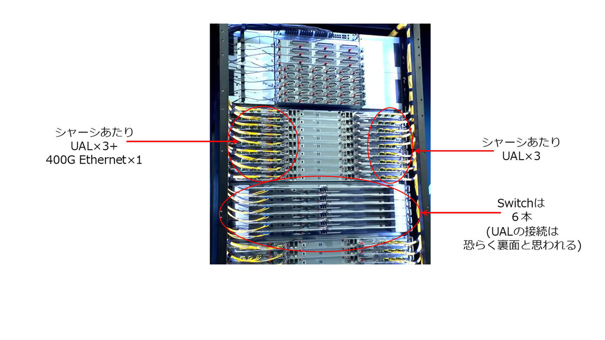 あらためて基調講演で示されたHeliosのラックが下の画像であるが、このブレードとスイッチの構成推定が下図である。
