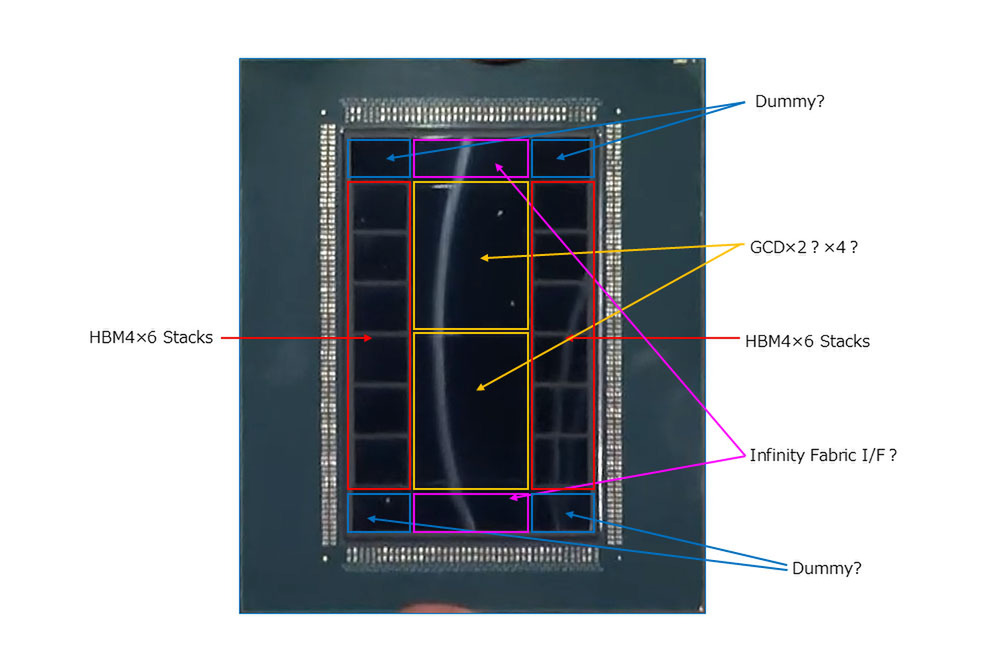 それぞれのダイの左右にHBM4が3スタックずつ配置され、合計で12スタックとなる。その上下にあるのはダミーのダイな気がするのだが、問題はGCDの上下に配される横長のダイである。可能性としてあるのはインフィニティ・ファブリック(とPCIeも入っているだろう)のI/Fだが、そうなるとMI350Xシリーズとは異なり、GCDやHBM4の下にIoDは存在しない可能性が出てくる。
