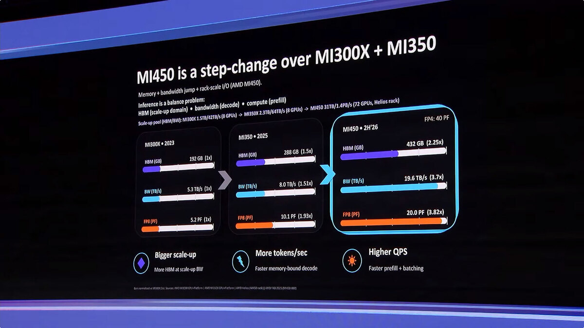 ざっくり言えばMI350の2倍の演算性能と1.5倍のメモリー容量、2.45倍のメモリー帯域という構成になる。先の2.9EFlopsは、40PFlops×72=2880PFlopsで、丸めると2.9EFlopsという数字になるわけで、NVIDIAのRubinの50PFlops(FP4)には若干およばないものの、決して低い数字ではない。