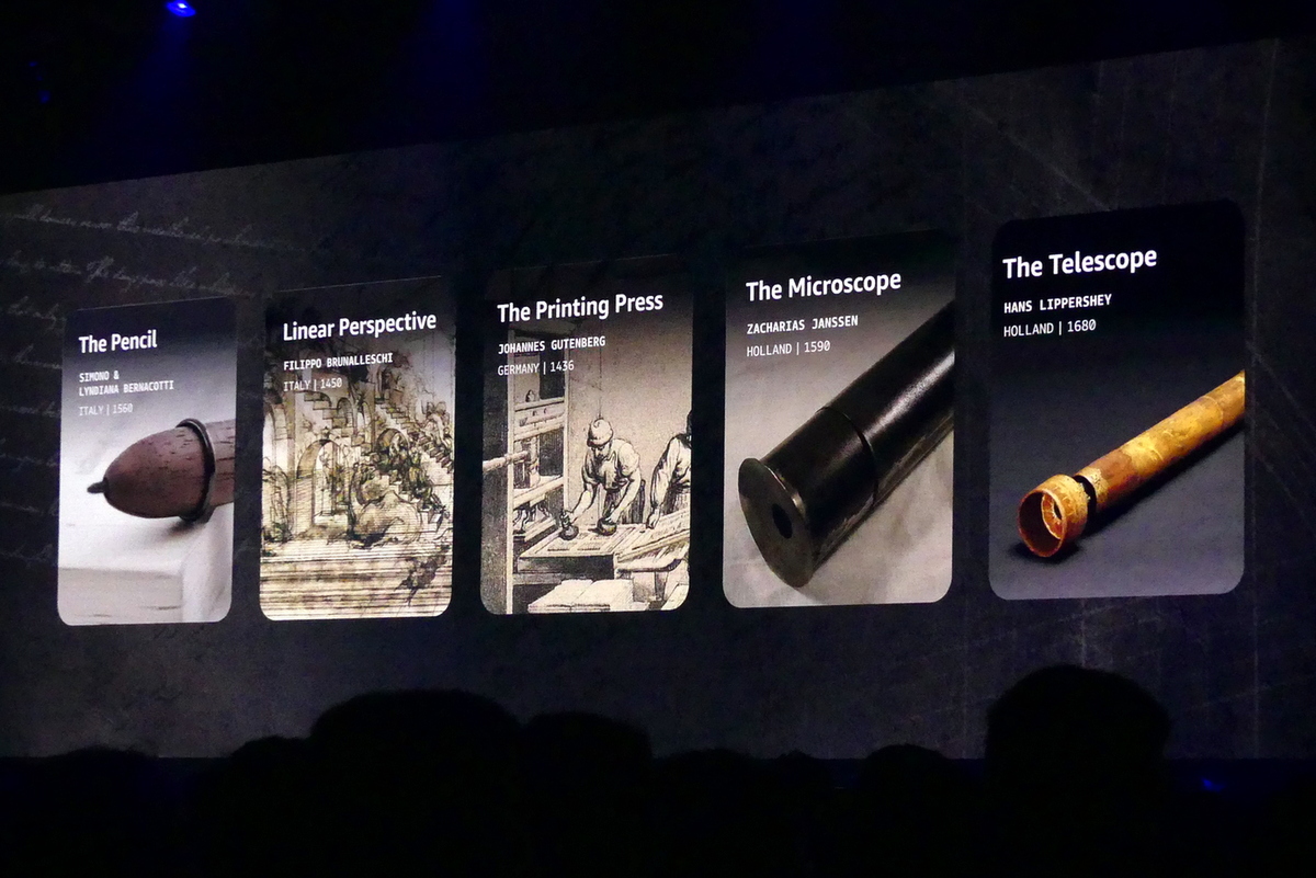 同時に進化したのは道具だった。イタリアでは鉛筆が発明され、遠近法という概念が生まれた。活版印刷や望遠鏡、顕微鏡などが生まれたのもこの時代。活版印刷の開発者であるグーテンベルグは最初のテープにワイン圧搾機を使ったが、活版印刷を実現するためにはそれぞれの文字で利用できるインクも発明しなければならなかった。「当時からすると、想像上の世界の話だ。でも、芸術と科学が同じ対話の一部にあった。創造性とテクノロジーはともに進化した」とボーガス氏は語る。