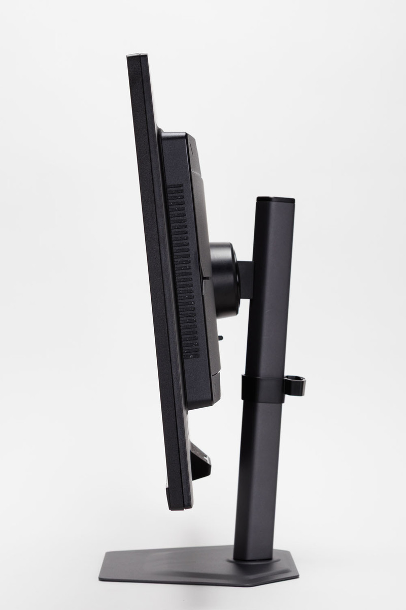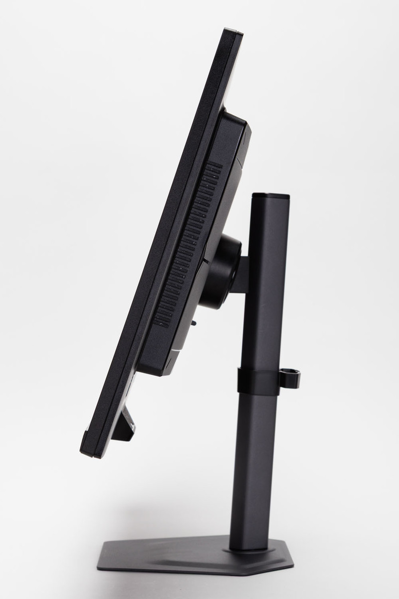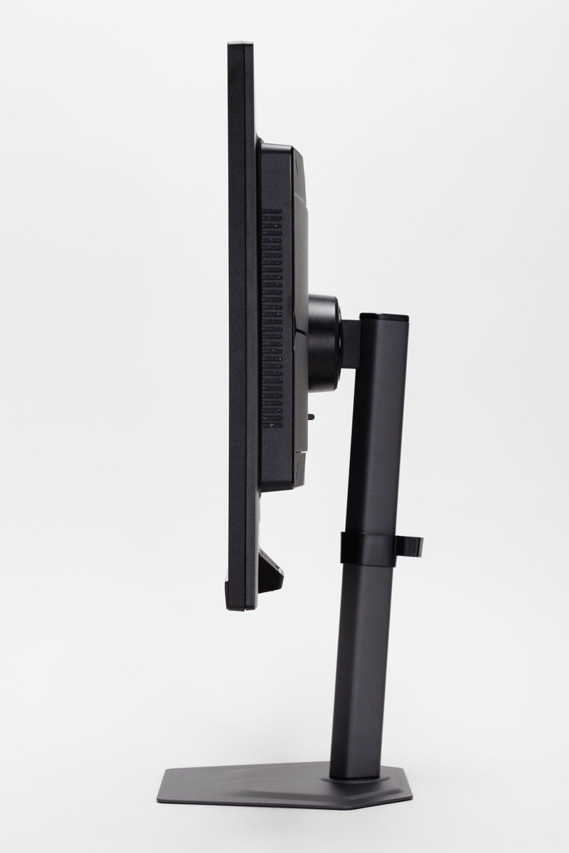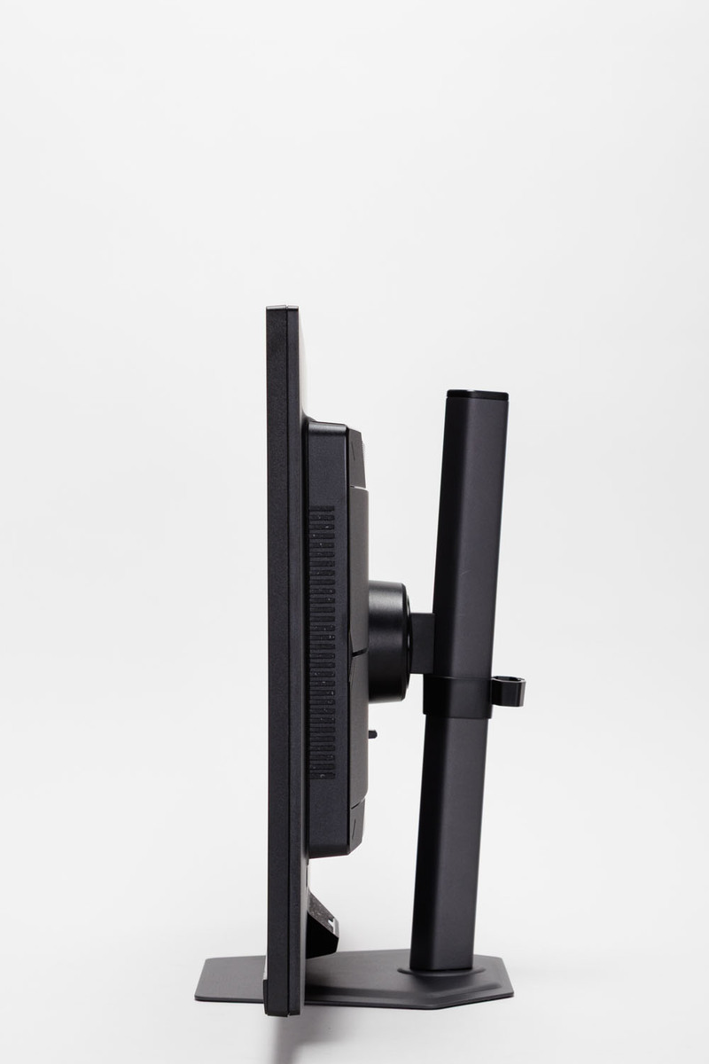 スタンドのエルゴノミクスも秀逸だ。基本となる高低移動と、上下左右の首振りに対応。長時間のPC作業でも疲れにくい姿勢を保てる。また回転させて縦置きにできるピボットにも対応しているので、ビジネスシーンでも活用できるだろう。