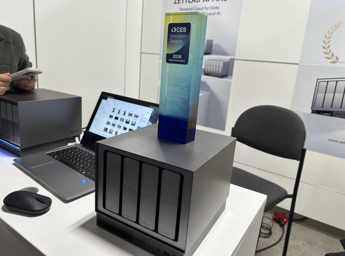 ちなみにCESでは、特に優れた出展製品やサービスには「Best of Innovation Award」が贈られます。そのうち「コンピュータ周辺機器・アクセサリー部門」で受賞した、深セン・Zettlab Innovation TechnologyのAI搭載NAS「Zettlab AI NAS」も展示されていました。