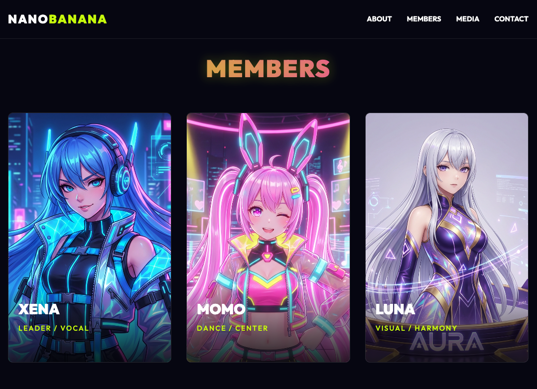 バーチャルアイドルのランディングページ。力強いメインビジュアルに、カード状のメンバー紹介、ロールオーバー時のインタラクティブな演出など、プロモーション用LPとして必要な要素は一通り備わっている。