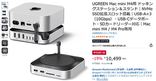 UGREENの「Mac mini M4/M4 Pro専用」ドッキングステーション&スタンドがAmazonタイムセール対象です。参考価格12,990円から19%オフの10,499円。