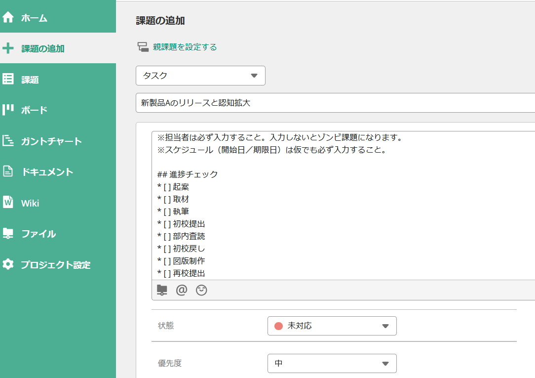 Backlogではタスクを「課題」として起票する。今回の事例であれば「新製品Aのリリースと認知拡大」という親課題を起票し、プレスリリースやSNSなど施策を「子課題」として起票する。子課題にはチェック項目を設け、期限と担当者を割り当て、完了条件を設定する。以下、事業部と広報チームのやりとりはすべてこのBacklogで行なうようにする。種別やカテゴリーなどで課題を分類しておけば検索性も高まり、必要な情報をすぐに入手できる。