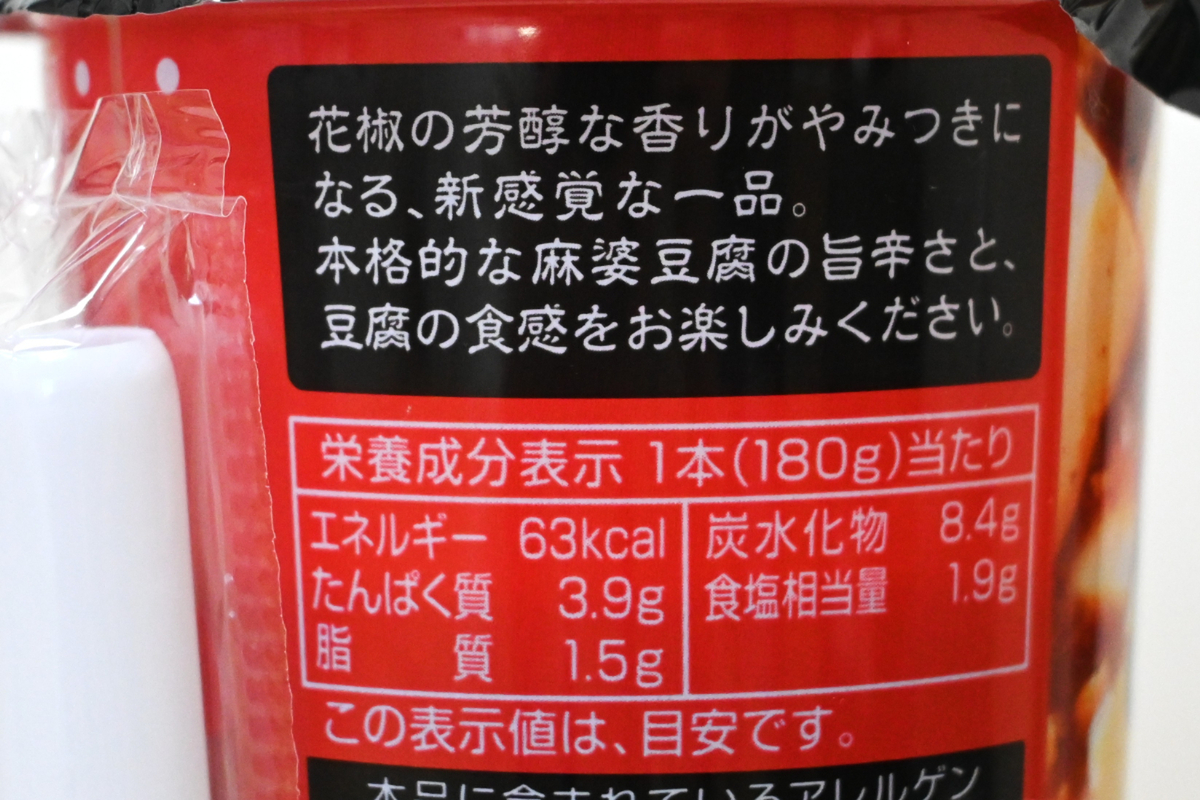 チルドカップにおさまった“飲料”タイプの商品で、その名のとおり「飲む」麻婆豆腐。冷やして飲む仕様という、なかなか攻めた一品。内容量は180ml、価格は298円です。