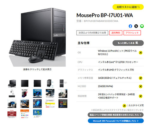 Core i7-12700を搭載した上位構成モデル。画像処理やデータ量の多い業務など、CPU性能を重視したい人向けです。アウトレットながら、長期保証がそのままなのは安心材料。「長く使う前提」で検討しやすい構成です。