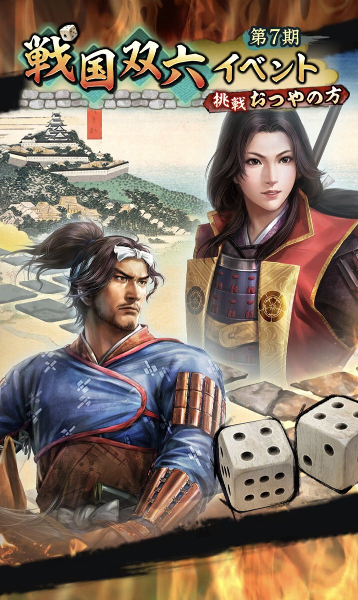 戦国双六イベントとは、賽(さい)を振って道中を進み、本丸にいる敵城主の撃破を目指すイベント。今回の敵城主は、岩村城主として知られる「おつやの方」となる。