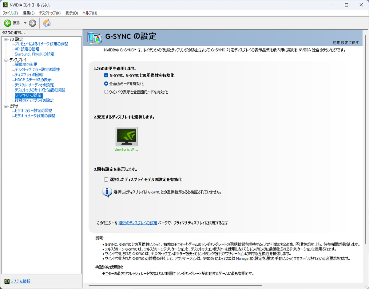 ちなみに、「GeForce RTX 5060 Ti」を搭載したPCに「VP2456」を接続し「Adaptive Sync」を有効にしてみると、G-Syncの互換モードである「G-Sync Compatible」として動作した。そのため、フリッカー(チラつき)やスタッタリング(カクつき)といったゲームプレイ中の画面の乱れを抑えられる点はありがたい。