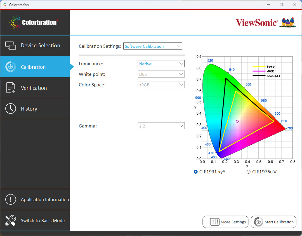 「Colorbration+」の画面では、「Calibration」のサブメニューの「Calibration Settings」の項目で、「Adobe RGB」「sRGB」「DCI-P3」「Photography」「Web Design」「Printing」といった用途に合わせたプリセットが用意されている。また、輝度の変更や色空間の選択などを行ない、「Start Calibration」を選択すると、設定した内容どおりに自動的にキャリブレーションする仕組みだ。