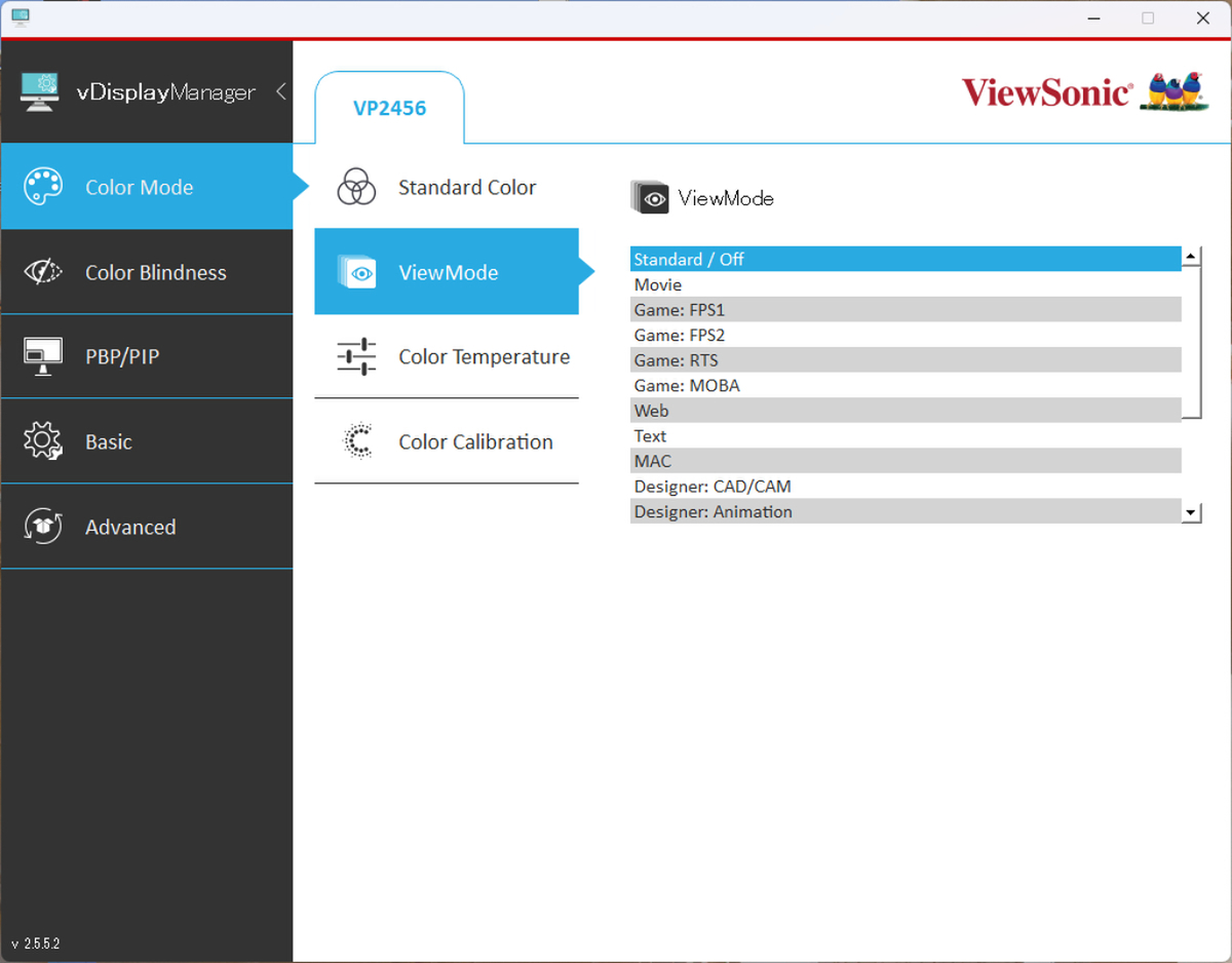 「vDisplay Manager 2.0」では、コントラストの設定や輝度の変更はもちろんのこと、シャープネスの設定やブルーライト軽減機能の度合いを調整可能。さらに、「ViewMode」と呼ばれる用途に合わせたプリセットが用意されている点にも注目したい。用意されているプリセットは、「Standard」「Movie」「Game:FPS 1」「Game:FPS 2」「Game:RTS」「Game:MOBA」「Web」「Text」「MAC」「Designer:CAD/CAM」「Designer:Animation」「Designer:Video Edit」「Photographer:Retro」「Photographer:Photo」「Photographer:Landscape」「Photographer:Portrait」「Photographer:Mono chrome」の17個。ゲームのジャンルに合わせた設定や、写真の内容が細分化されているあたりはユニークだ。