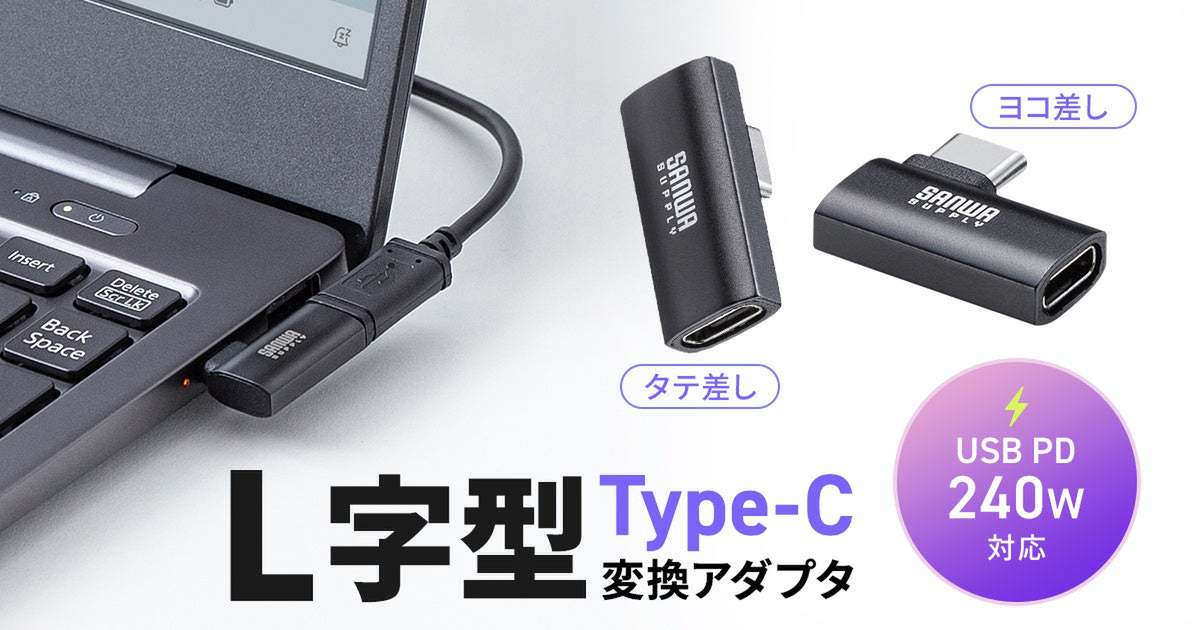 AD-USB35CCFLYとAD-USB36CCFLTは、最大40Gbpsの高速データ転送、240WのUSB PD給電、8K/60Hzの高解像度映像出力に対応した製品だ。L字型のデザインにより、壁際や機器近くの狭いスペースでもすっきりと利用できる。