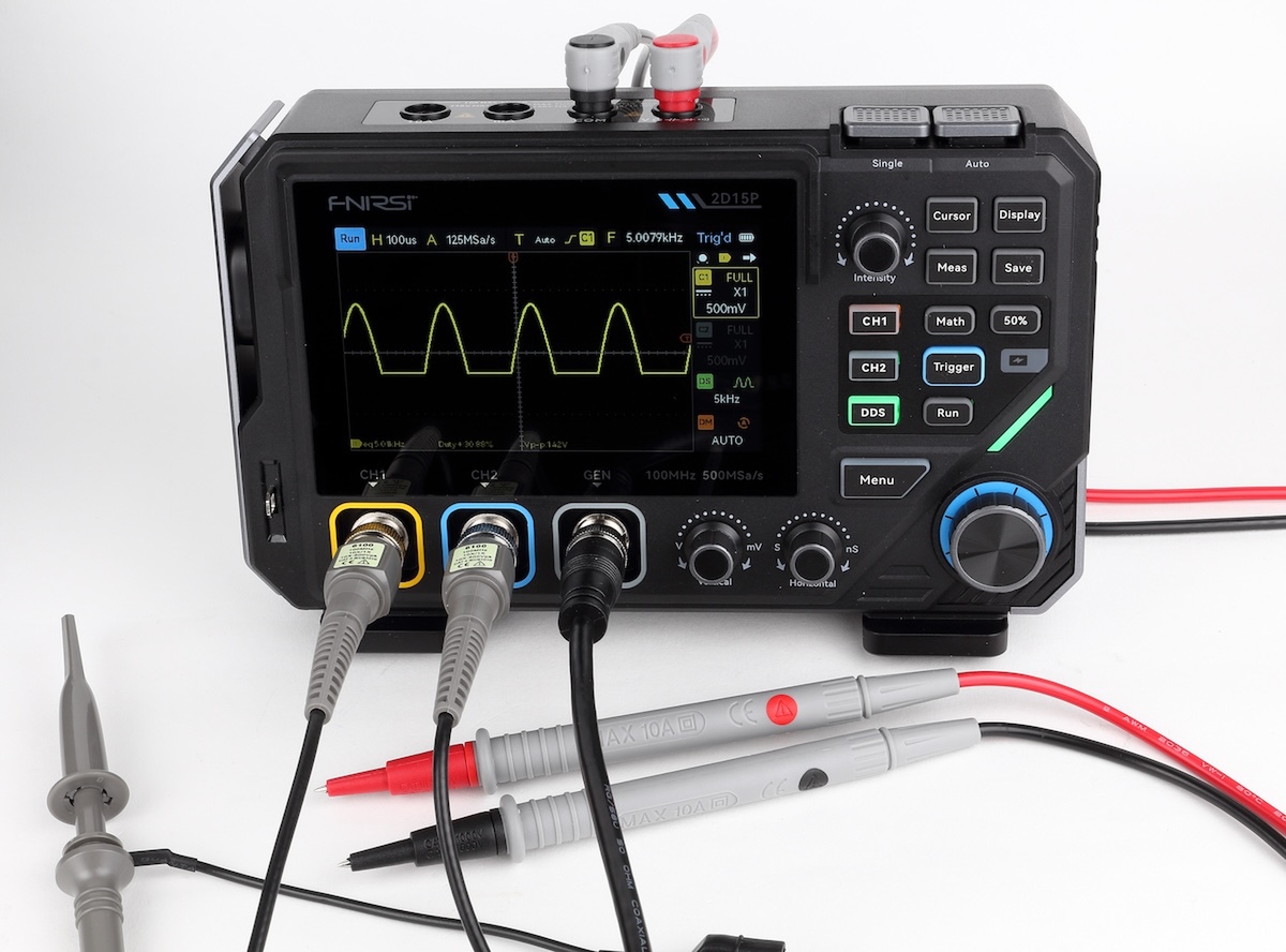 今回紹介するFNIRSIの「2D15P」(Amazon価格 3万3999円)は、100MHz対応の2chオシロスコープ。タッチ操作に対応したバッテリー内蔵モデルで、比較的小型となるため、個人が趣味で使うのにピッタリな製品です。