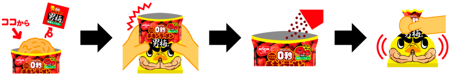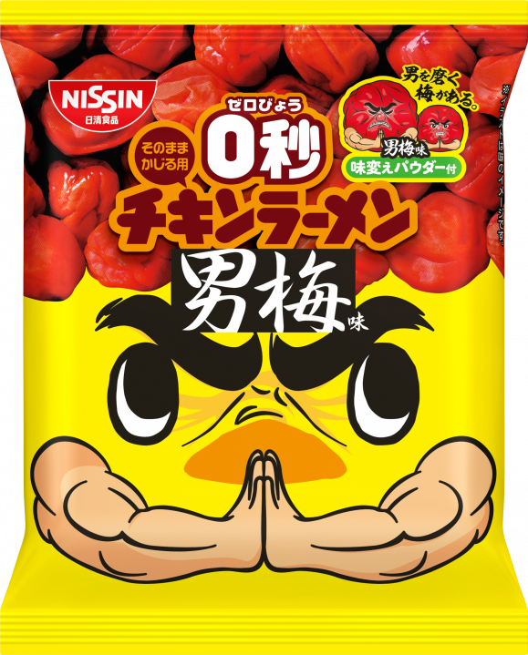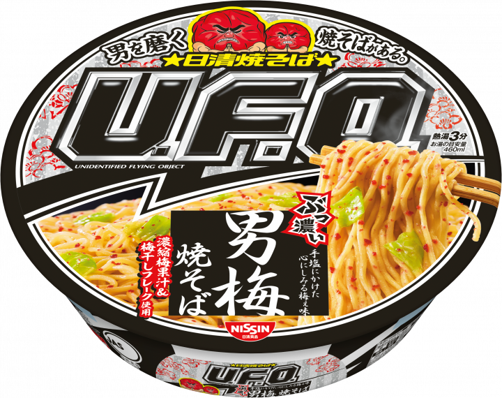 日清食品のロングセラーで「日清焼そばU.F.O.」と「チキンラーメン」が、ノーベル製菓の「男梅」とコラボレーションを果たす。