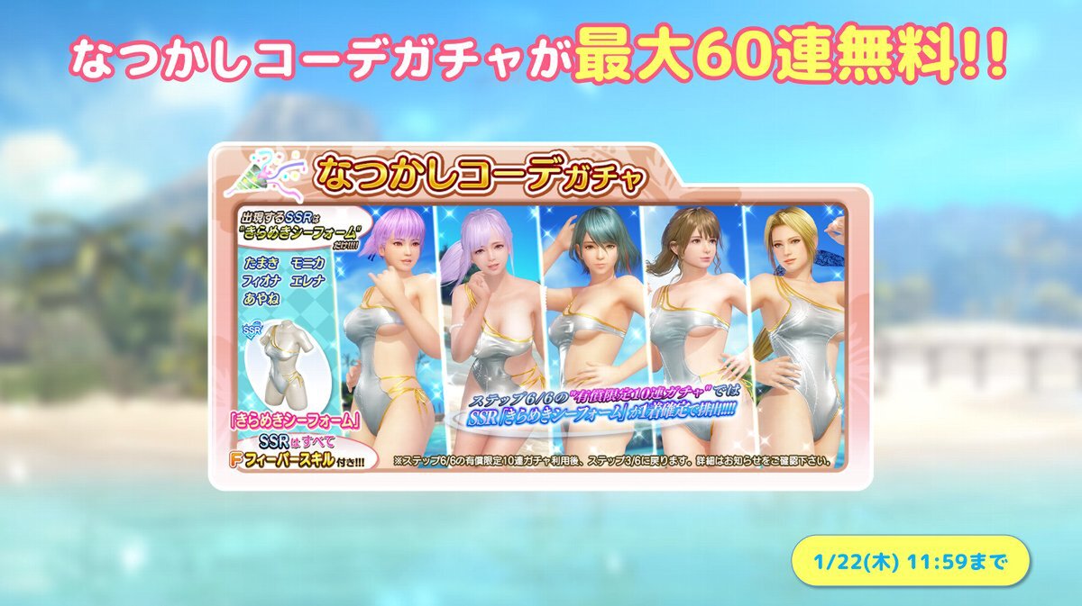 過去に登場した5人の女の子のSSR水着「きらめきシーフォーム」がなつかしコーデガチャで再登場。期間中、なつかしコーデガチャ専用の10連ガチャチケットが毎日もらえるログインボーナスを開催する(最大6日間)。