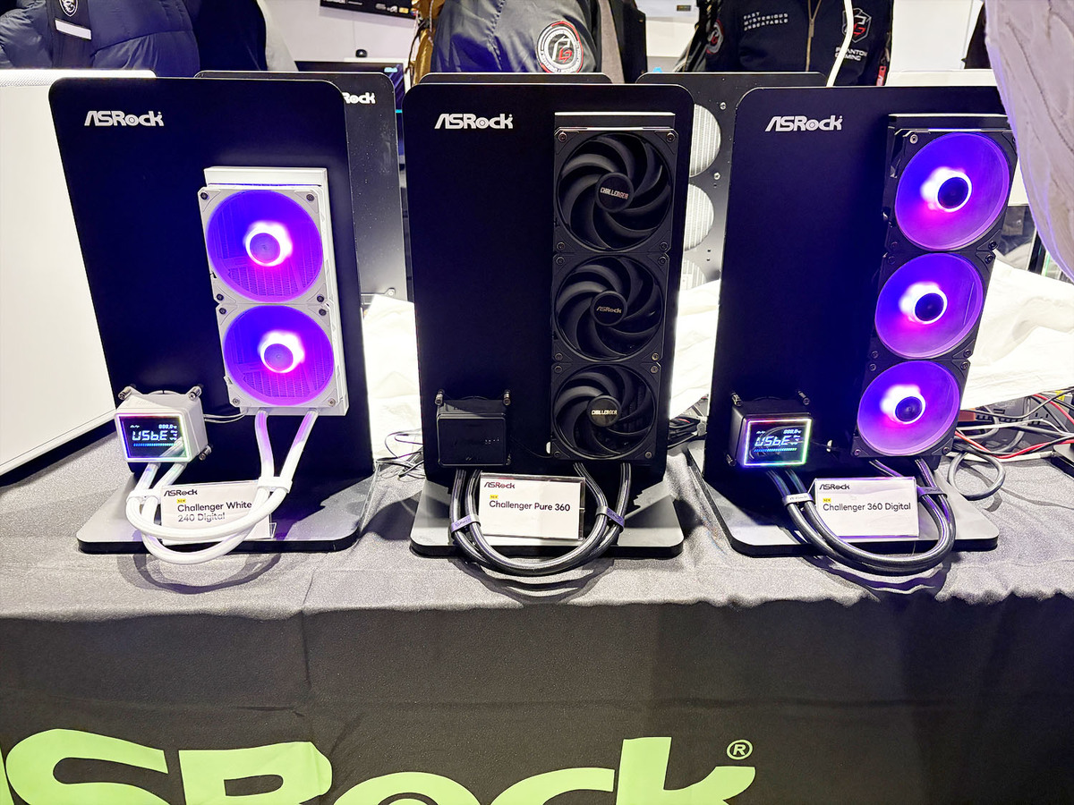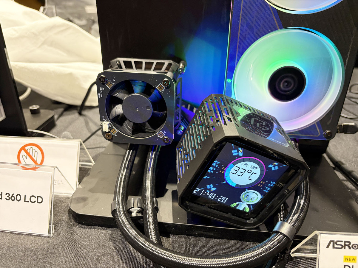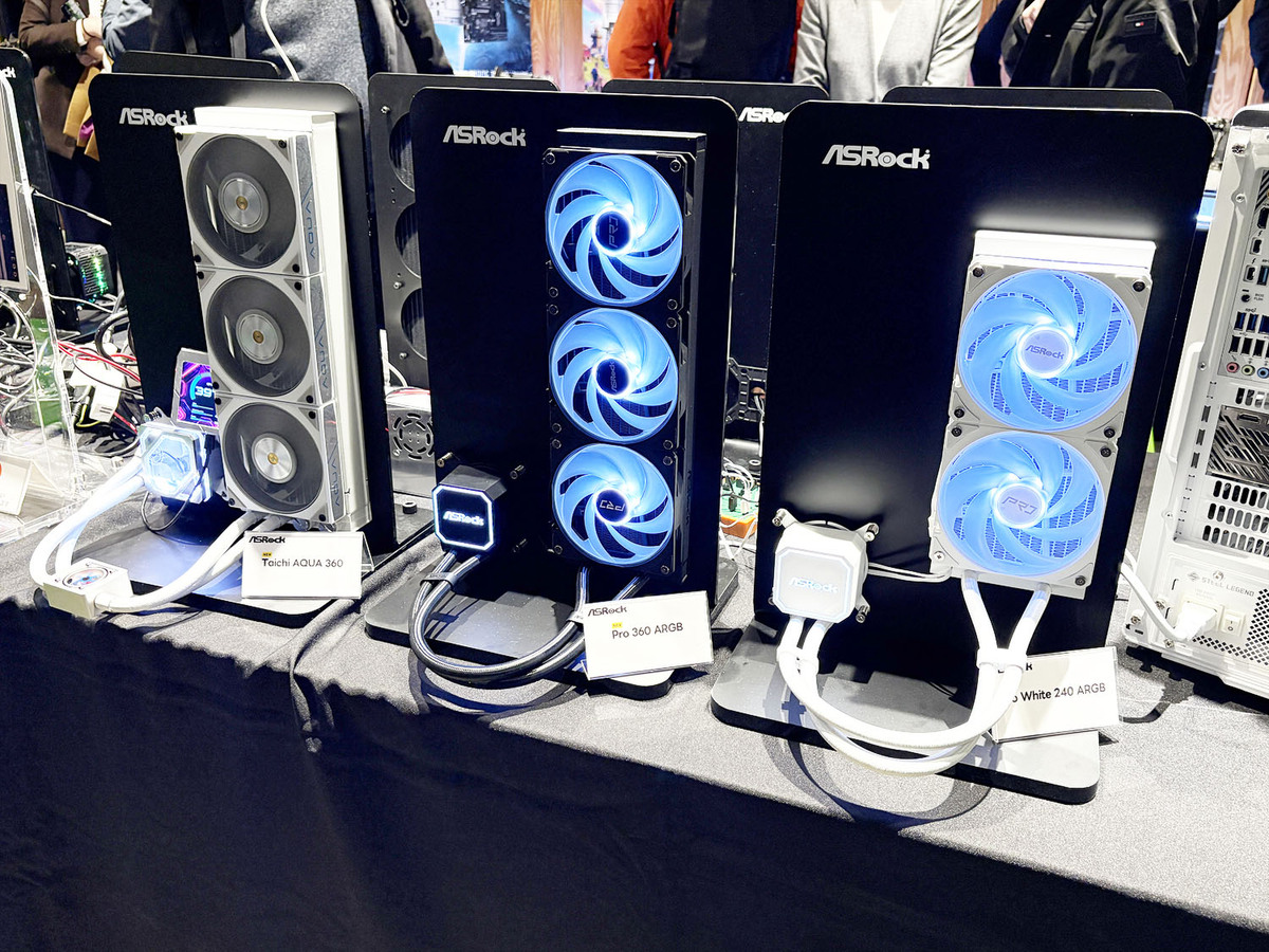 会場の目立つ位置に置かれていたのが、ASRock初の簡易水冷ユニットだ。水冷CPUクーラー分野への進出は、ASRockの強みを戦略的に拡大するもので、マザーボードプラットフォームとの統合と、より強力なエコシステムによる相乗効果を実現するものだという。単に水冷クーラーを製品ラインナップに加えたわけではなく「ASRockの自然な進化であり、追加ではない」と強調していた。
