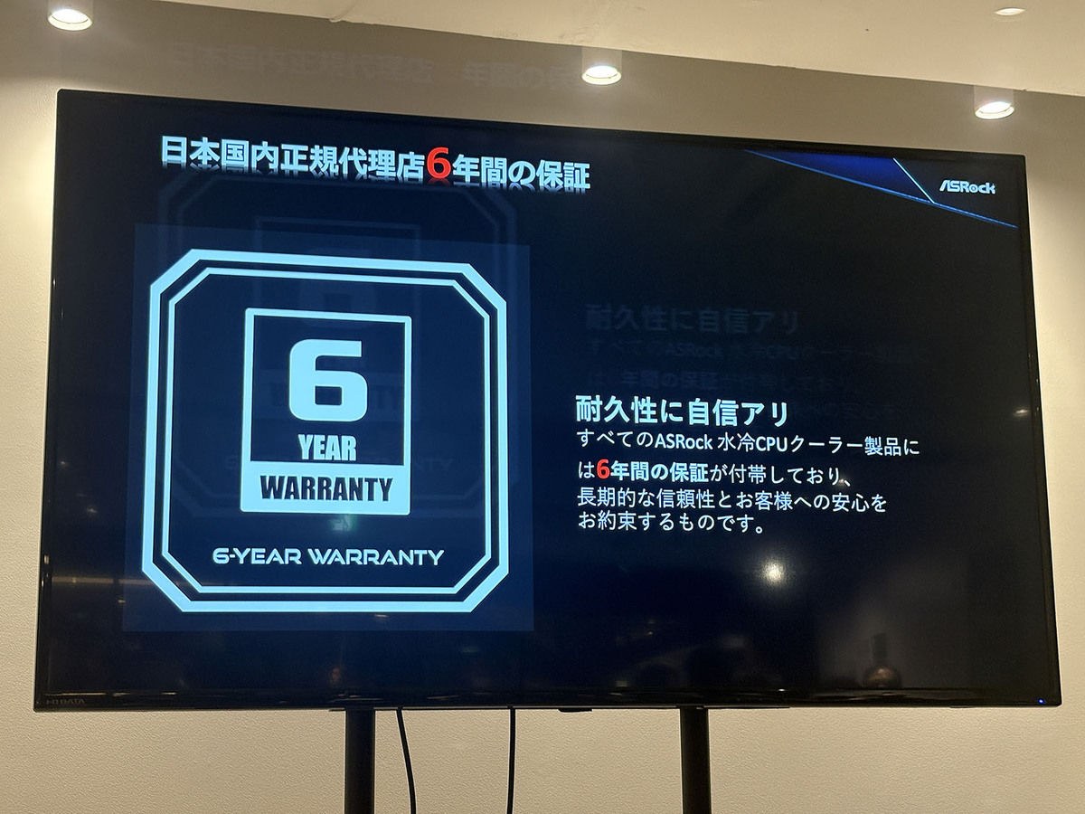 ASRockの水冷ユニットは6年保証が付帯している。長期保証を実現するために、冷却液の蒸発を防ぐチューブを採用。冷却液は温度80度の運用で13年間持つ設計だという