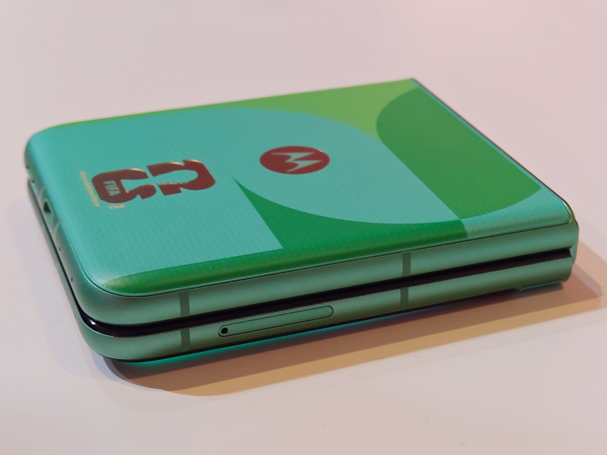 ベースとなるスマートフォンは日本でも販売中の「razr 60」(北米では「razr 2025」)。閉じると3.6型、開くと6.9型のディスプレーが利用できる。ボディーカラーはサッカーフィールドの芝と情熱を思わせるグリーンで、背面には大会ロゴもプリントされている。