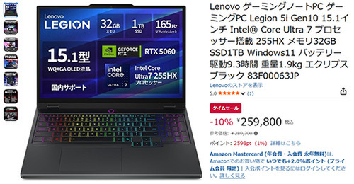 【Amazonタイムセール】Lenovo ゲーミングノートPC「Legion 5i Gen 10(83F00063JP)」をチェック!