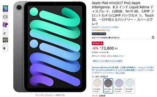 8.3インチのLiquid Retinaディスプレイを備え、A17 ProチップやApple Intelligence、Wi-Fi 6Eに対応したモデル。価格は参考価格78,800円から6%オフの73,800円です。