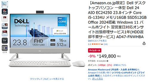 【Amazonタイムセール】Dell 23.8インチ一体型デスクトップPC「Dell 24 AIO EC24250(AD47-FNWHBA)」をチェック!