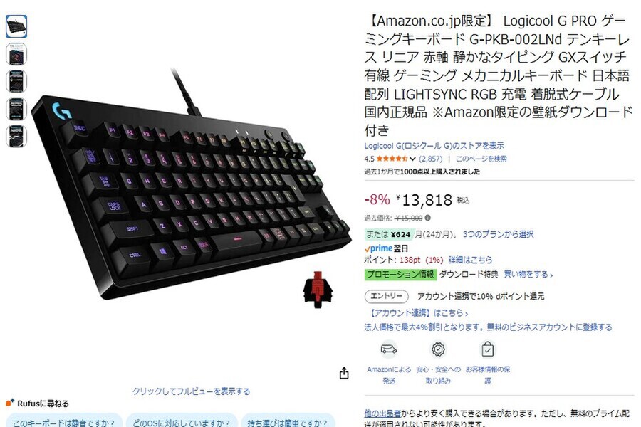 Amazon.co.jpにて、ロジクールGのゲーミングキーボード「G-PKB-002LNd」が販売中だ。価格は1万3818円。