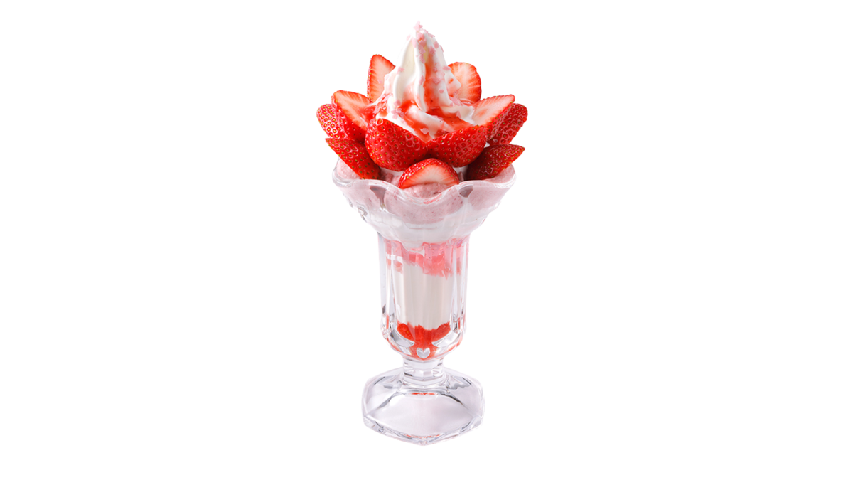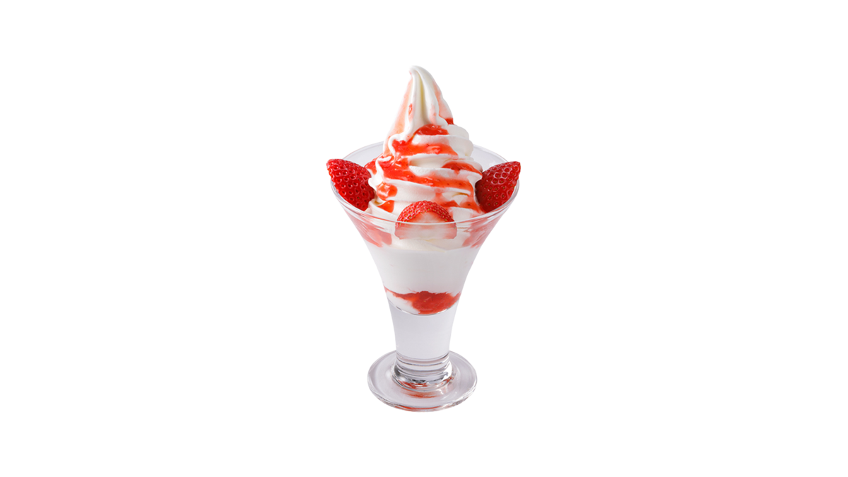 北海道ソフトクリームにいちごソースを合わせ、完熟いちごをトッピングした小ぶりなサイズのデザートです。