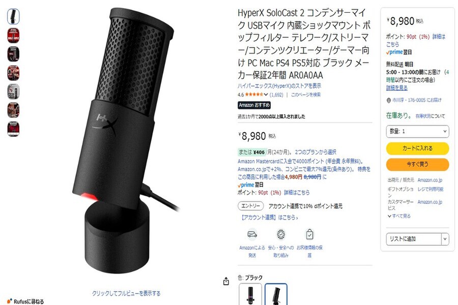 Amazon.co.jpにて、HyperXのコンデンサーマイク「SoloCast 2」が販売中だ。価格は8980円。