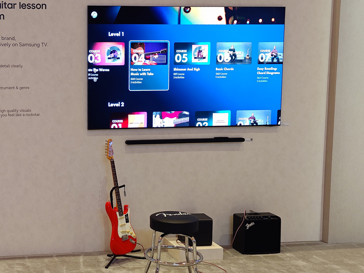 Tizen OS上で動く多数のアプリも提供されており、カラオケアプリではテレビと接続したスマートフォンをマイクにしたり、場を盛り上げるタンバリンなどの楽器にすることもできる。そして新たに楽器メーカーのFender(フェンダー)とも提携。世界初という「Fender Play」アプリで、テレビを使いながらエレキギター、アコースティックギター、ベース、ウクレレのレッスンができるという。2026年モデルのテレビに加え、過去の一部テレビにもOSアップデートで利用可能になる予定だ。