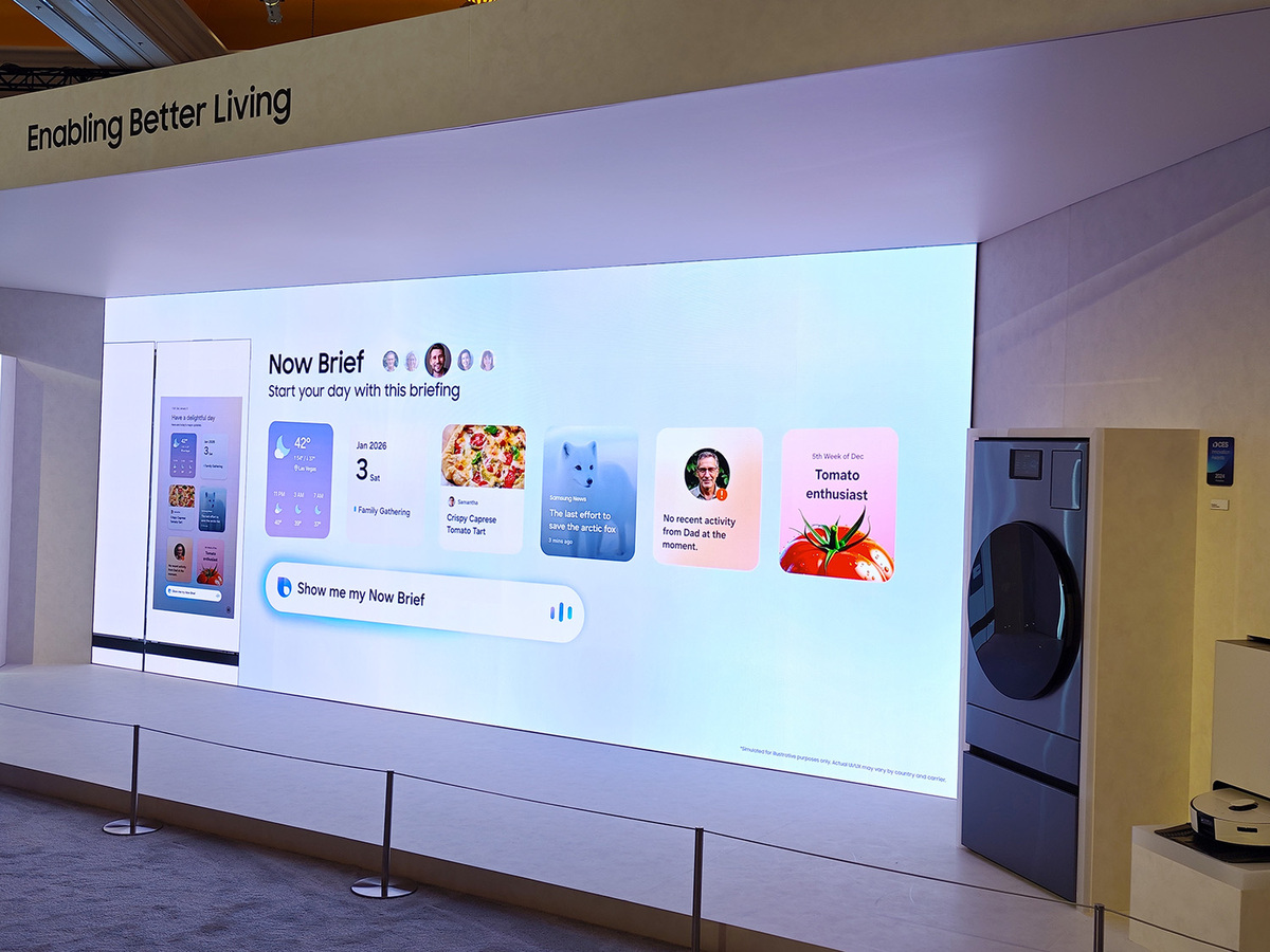 冷蔵庫などの白物家電の展示でも、AIの統合が大きくアピールされていた。サムスンは大型ディスプレーを備えた冷蔵庫「Family Hub」を家庭内スマート家電のハブとして位置づけており、その画面にはカレンダーや天気予報といったウィジェットを表示できる。そして新しいウィジェットとしてスマートフォンに展開している「Now Brief」を搭載。