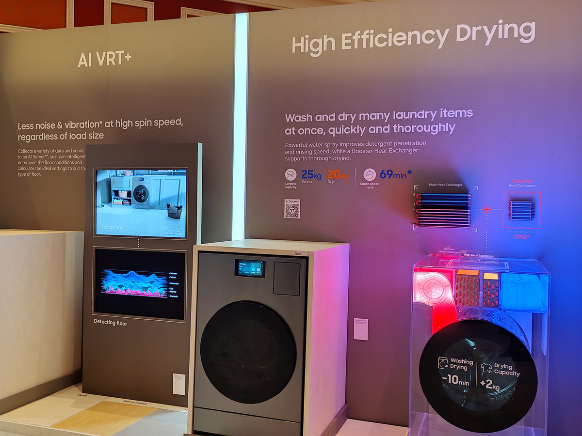 家電へのAIの応用は家屋の気配りにも対応している。スマート洗濯機が搭載する「AI VRT+」は、全自動洗濯機の騒音や振動を低減させる技術だ。これは洗濯機に搭載された複数のセンサーが洗濯中の振動や加速度信号を読み取り、AIが床の種類を推測。床の条件と洗濯量に応じて脱水時の回転パターンを最適化し、共振を避けることで揺れや騒音を減らすことができる。洗濯機の洗浄能力アップや乾燥機の熱効率向上といった技術だけではなく、生活空間の静けさや快適さを損なわないことを重視した技術開発も進めているのだ。