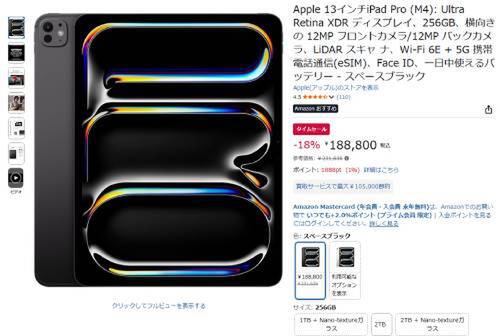 Appleの「13インチiPad Pro(M4)」256GB/Wi-Fi+Cellularモデルが、Amazonタイムセール対象です。参考価格231,636円から18%オフとなり、現在は188,800円で販売されています。
