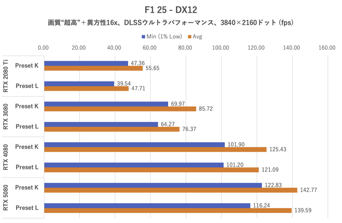 プリセットMではRTX 5080でもフレームレートを見てわかる程度のペナルティーをくらうが、プリセットLを使用すると劇的に軽減される。もちろん、プリセットLはRTX 2080 TiやRTX 3080だとフレームレートの低下は不可避だが、プリセットM使用時よりも高かった。