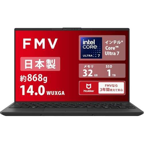 FMV「WU1-K1」は、軽さを重視しつつ、構成で妥協しにくい14型モバイルです。約868gのボディにCore Ultra 7、32GBメモリ、1TB SSDを組み合わせており、長く使う前提でも不安は少なそうです。14インチの作業性と携帯性を両立したモデルとして、6%オフ・25万円台なら検討しやすそうです。