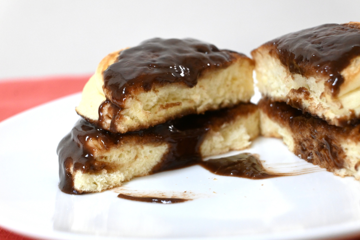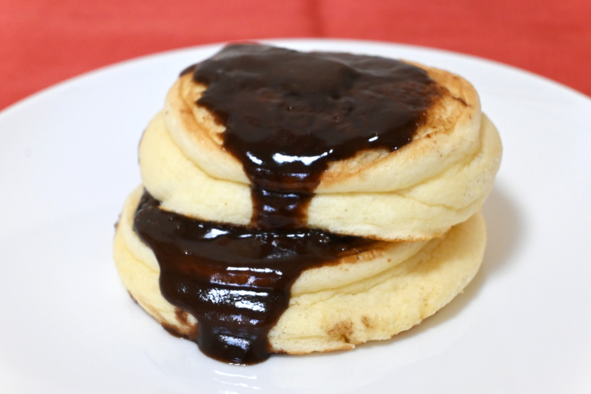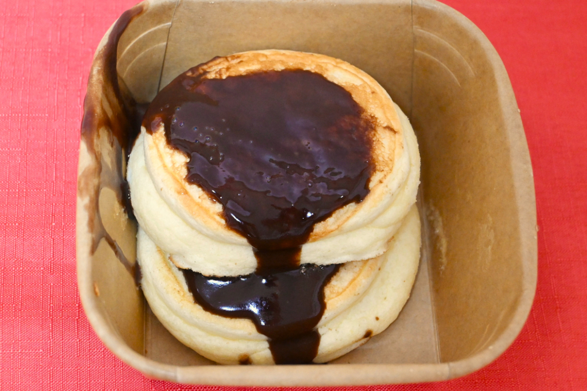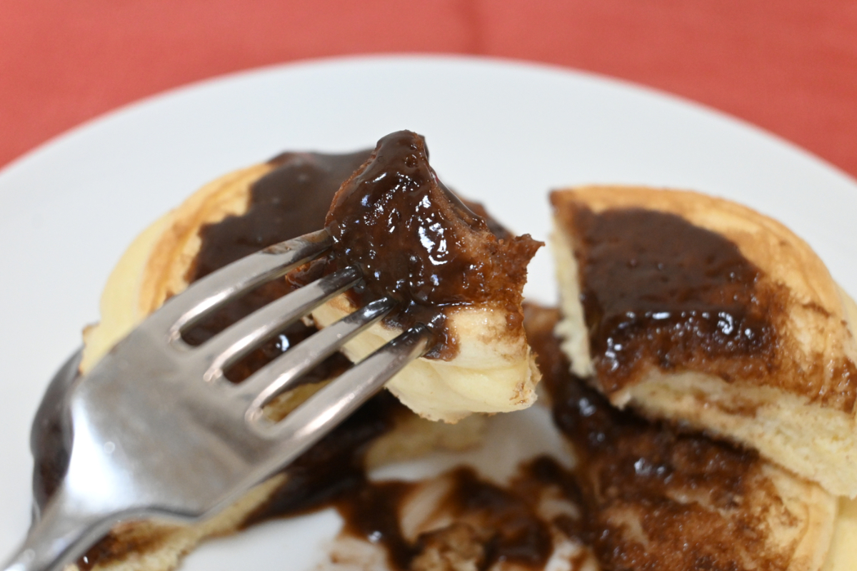 チョコソースはミルク感たっぷりで、いい意味でプレーン。気軽に食べられる味設計で、軽い食感のパンケーキとよい相性でした。