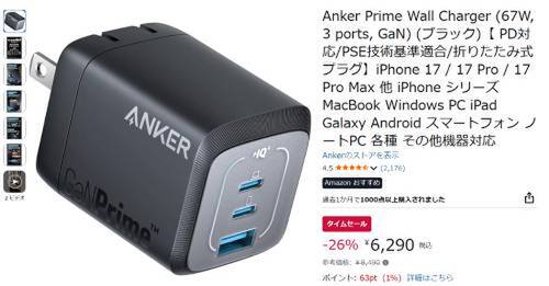 Ankerの67W出力・3ポート対応USB急速充電器「Anker Prime Wall Charger (67W, 3 ports, GaN)」がタイムセール対象です。参考価格8,490円のところ、26%オフの6,290円で販売されています。